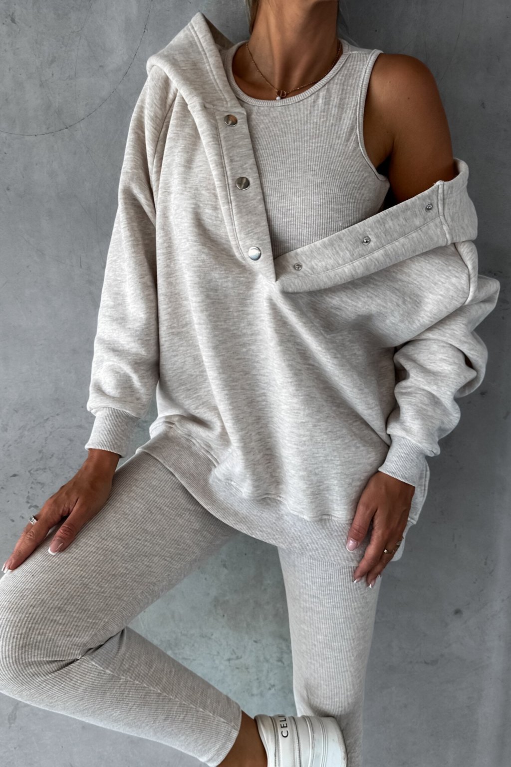 Pohodlný komplet Paloma 3v1 se skládá z mikiny, topu a žebrovaných legín. Tento model bude perfektní pro každodenní použití díky tomu, že je vyroben z příjemné a pohodlné látky. Nosit lze společně i samostatně a tak využít např. legíny do jiného outfitu.