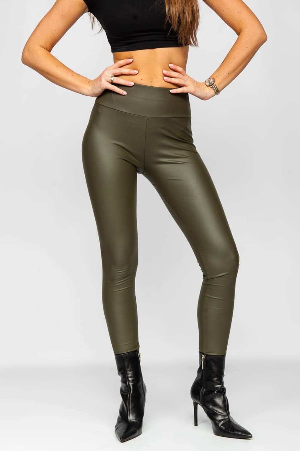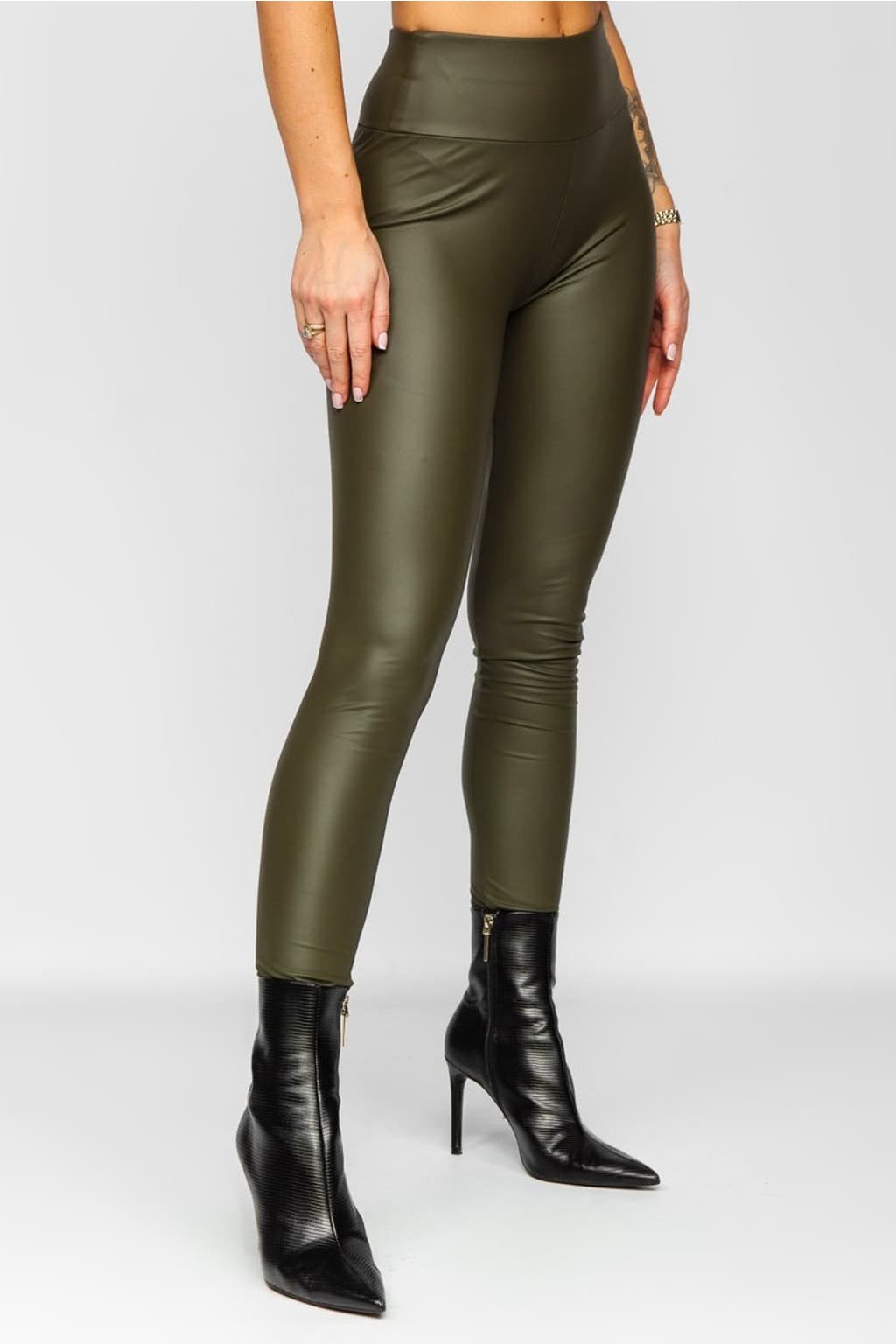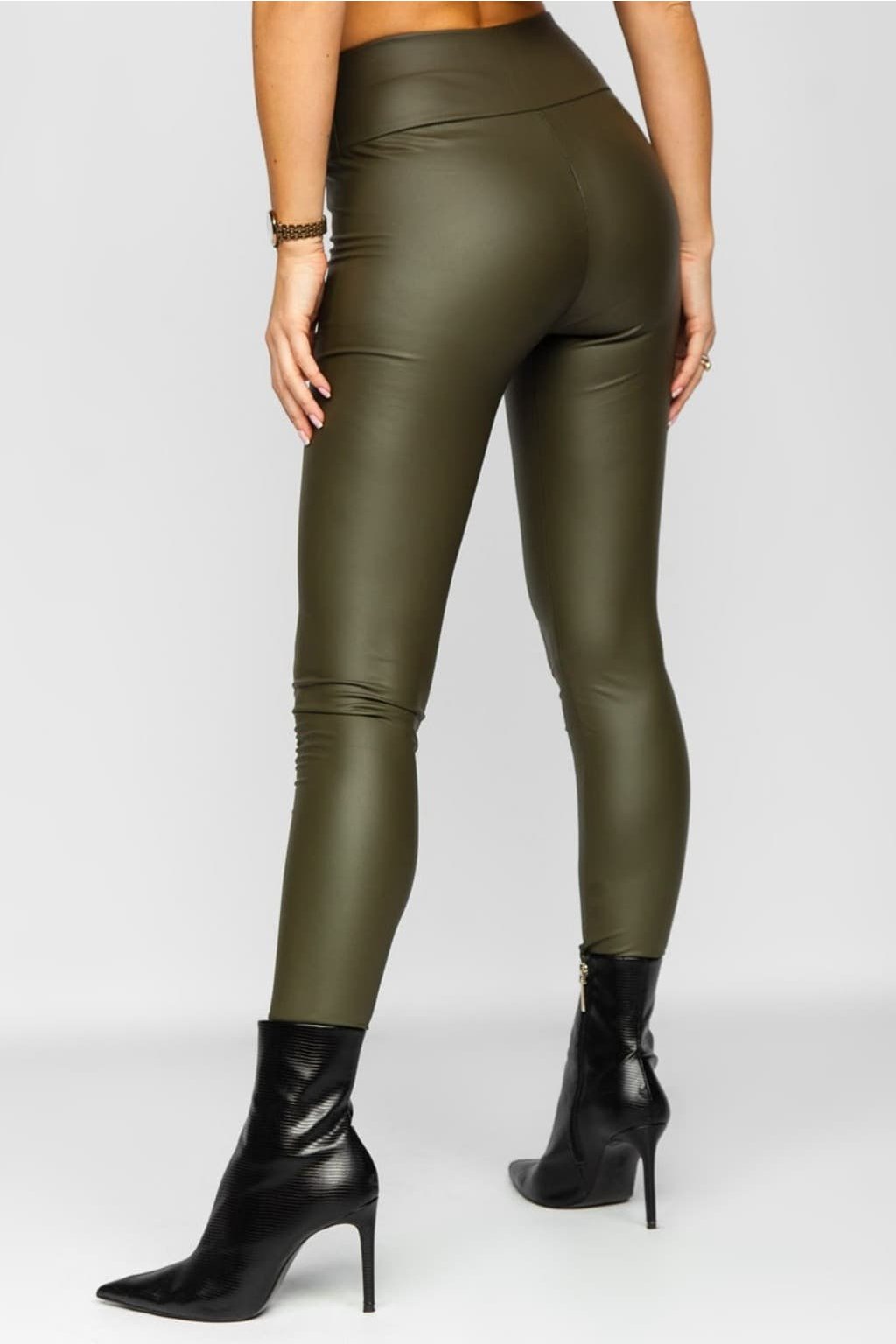 Dámské koženkové legíny v khaki barvě.