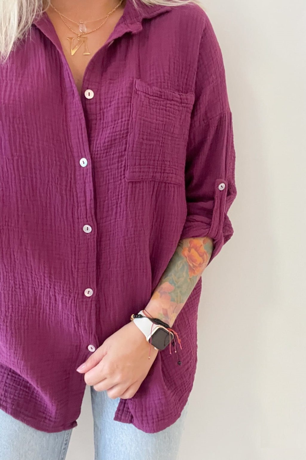 Mušelínová košile je skvělým kouskem nejen pro vaše letní outfity. Můžete ji nosit na kalhoty, na šortky nebo i jako přehoz na plavky. Zapínání je na knoflíky, rukávy lze nosit klasicky nebo na knoflíky jako 3/4. Mušelín je jemný, příjemný a vzdušný materiál, který si zamilujete.